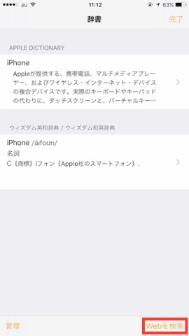 ●辞書が表示されている画面で、右下の「Webを検索」をタップすれば、すぐにSafariが開いて検索できます